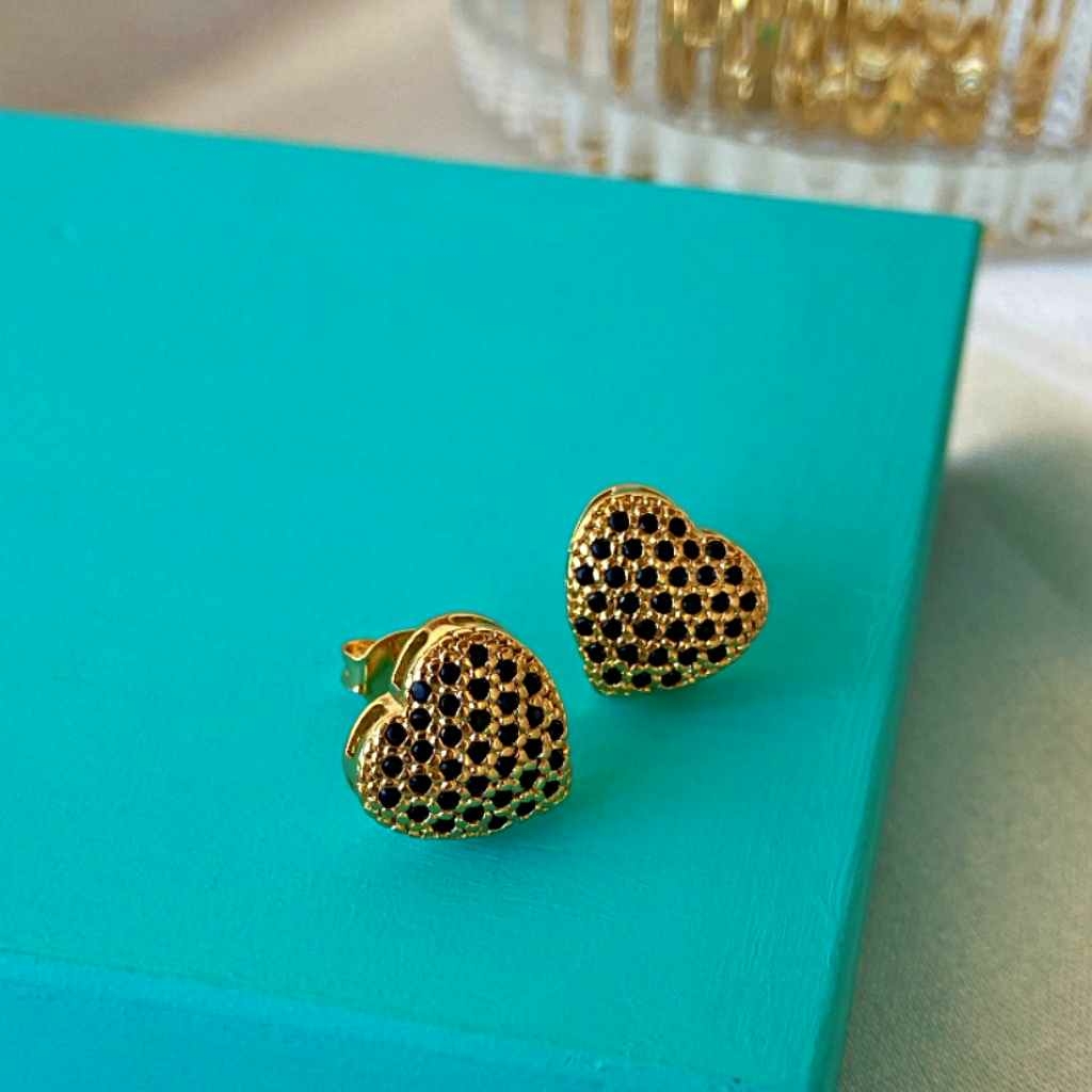 O brinco clássico e que nunca sai de moda, nosso Brinco coração g cravejado preto banhado a ouro 18k é a joia perfeita para te acompanhar em várias ocasiões.